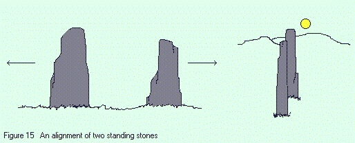 The stones are usually of local rock, and can vary from squat blocks to tall thin slabs. As well as astronomical markers, some stones have been interpreted as battle memorials, route markers or indications of territorial boundaries. In some cases these interpretations may be correct, and many stones do not have any astronomical function. Some stones may also mark burials, but the area around most stones have never been excavated. (The carved Pictish stones belong to a much later period. But the Picts occasionally made carvings on standing stones of the Neolithic or Bronze ages, presumably to save the trouble of erecting a new stone). Standing stones are sometimes grouped in a line of two or more, and are then referred to as 'alignments'. Often, but not always, the longer sides or faces of the stones in the alignments are set on the same axis, so giving a convincing indication of the directions for an observer to look in (figure 15).