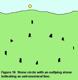 Another way which the prehistoric people used was to grade the stones in height, so that the tallest stone of the circle indicates the direction an observer should look (figure 17). This is done in the Clava sites, around Inverness. Another method was to use a large recumbent block, set between the largest stones of the circle, which an observer in the middle of the circle could look over to see the sun or moon on the horizon ; this is done at the recumbent stone circles around Aberdeen. There are sites of all these types featured here.